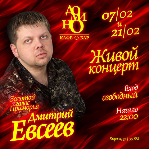 Дмитрий Евсеев – певец, музыкант, исполнитель популярных песен различных музыкальных жанров. Профессионально музыкой занимается более 20-ти лет.. В своём репертуаре имеет и авторские произведения. Снял два видео на свои песни. На его счету множество эфиров на радио AVN, ЛЕММА, Русское радио, Радио “Сахалин”, телеканалах AVN TV, Артём ТВ и др. Неоднократно становился победителем, дипломантом и лауреатом нескольких местных и региональных конкурсов и фестивалей.